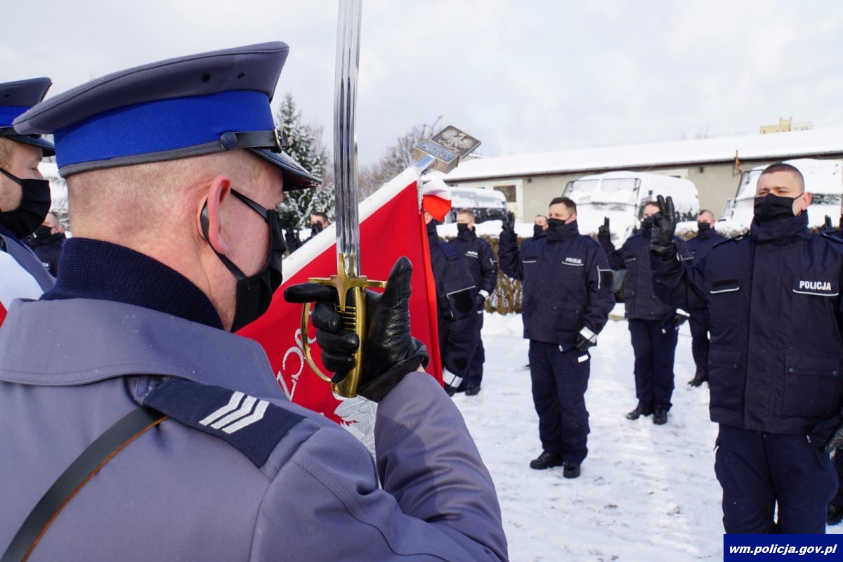 Nowi policjanci w obecności nadinsp. Tomasz Klimek Komendant Wojewódzki Policji w Olsztynie uroczyście ślubowali „służyć wiernie Narodowi, chronić ustanowiony Konstytucją Rzeczypospolitej Polskiej porządek prawny, strzec bezpieczeństwa Państwa i jego obywateli, nawet z narażeniem życia”.