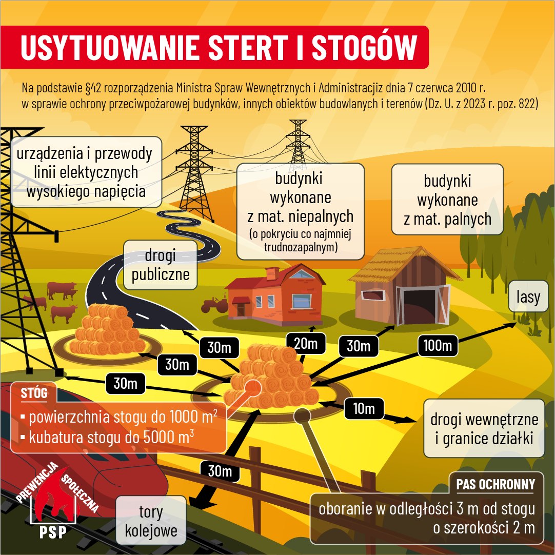 Aby zabudowania gospodarcze i płody rolne były odpowiednio zabezpieczone, zachowaj następujące odległości podczas umiejscowiania stogów w swoim gospodarstwie rolnym: