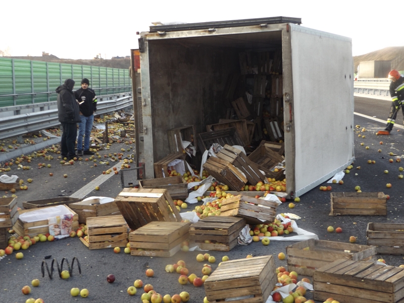 Do akcji z ostródzkiej JRG wyjechały samochód ratowniczo-gaśniczy, ciężki ratownictwa drogowego oraz rozpoznawczo ratowniczy. Na miejscu okazało się, że jest to auto dostawcze, które przewoziło jabłka. Samochód leżał na pasach ruchu po uderzeniu w bariery energochłonne. Wokół pojazdu i na odcinku kilkudziesięciu metrów drogi leżały rozsypane jabłka. Autem jechał sam kierowca, który nie odniósł obrażeń. Strażacy zabezpieczyli miejsce zdarzenia, odłączyli akumulator w pojeździe i zabezpieczyli wycieki płynów eksploatacyjnych sorbentem. Ponadto uprzątnęli i rozsypane jabłka z pasa awaryjnego, by umożliwić wznowienie ruchu drogowego na S7.