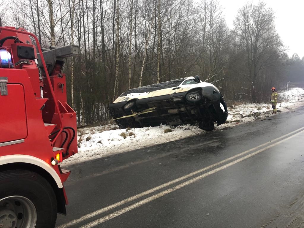 Pojazdem podróżowały trzy osoby: kierowca i dwóch pasażerów. Do akcji ratowniczej z morąskiej JRG wyjechały samochody: ratowniczo-gaśniczy, specjalny ciężki ratownictwa technicznego oraz rozpoznawczo ratowniczy. Na miejscu wypadku okazało się, że kierująca busem kobieta i podróżujący nim dwaj mężczyźni samodzielnie opuścili pojazd. Strażacy sprawdzili stan poszkodowanych. Nie odnieśli żadnych obrażeń. Leżący na boku pojazd zajmował częściowo pas jezdni, co stwarzało zagrożenie w ruchu drogowym. Strażacy przy pomocy ciężkiego samochodu ratownictwa technicznego postawili autobus na koła i usunęli w miejsce bezpieczne. Dzisiejszego poranka warunki drogowe w powiecie ostródzkim były bardzo trudne. Występowały opady marznącego deszczu.