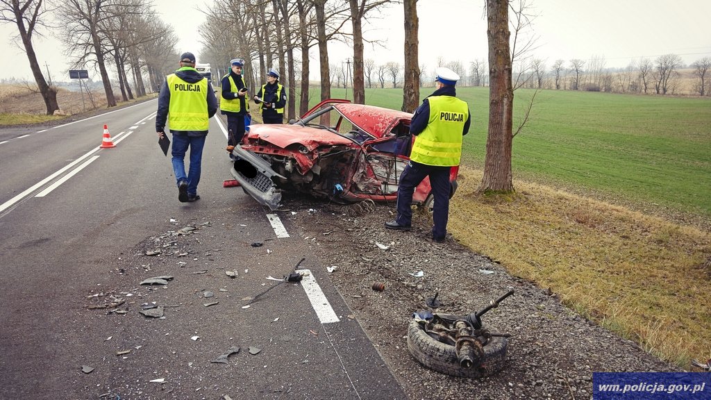 Do zdarzenia doszło w sobotę (19.11.2016) kilka minut przed godziną 17:00 w pobliżu miejscowości Grunwald. Ze wstępnych ustaleń policjantów wynika, że kierowca opla nie dostosował prędkości jazdy do panujących warunków na drodze zjechał na lewe pobocze jezdni uderzając w przydrożne drzewo.