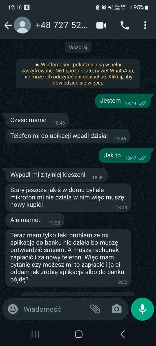 Oszustwo polega na tym, że sprawca podszywa się pod kogoś bliskiego, najczęściej córkę lub syna. Wysyła wiadomości SMS z nieznanego nam numeru telefonu z prośbą o pilny kontakt np. przez komunikator, zamieszczając w treści numer telefonu do kontaktu lub link. Oszust podaje informację, że telefon ,,naszego dziecka” uległ awarii i potrzebuje pieniędzy na zakup nowego.