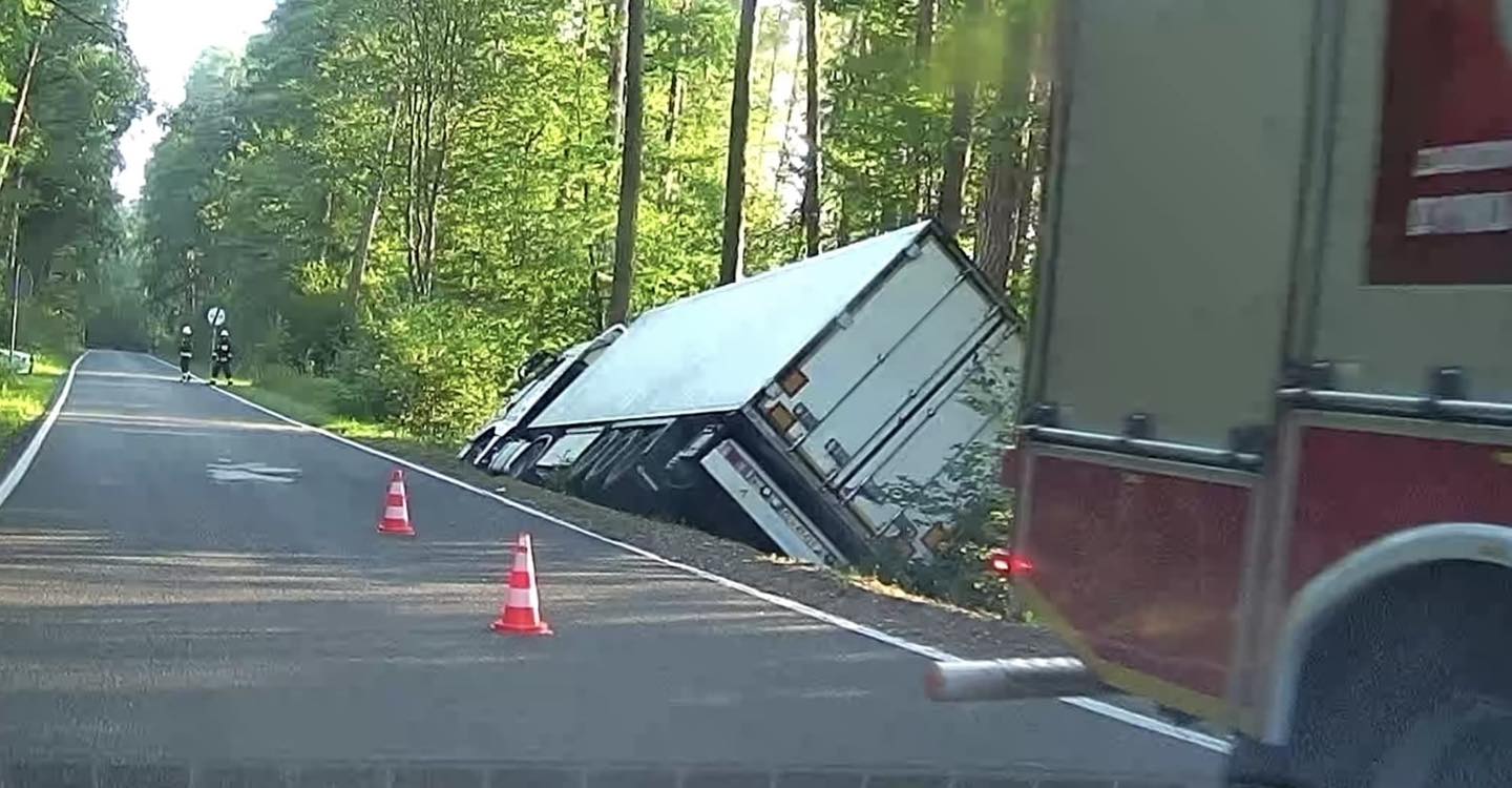 Kierujący samochodem ciężarowym marki MAN, pokonując łuk drogi w lewo, nie dostosował prędkości do warunków panujących na jezdni. W wyniku tego stracił panowanie nad pojazdem, zjechał na pobocze, a następnie wpadł do przydrożnego rowu, gdzie uderzył w drzewo.