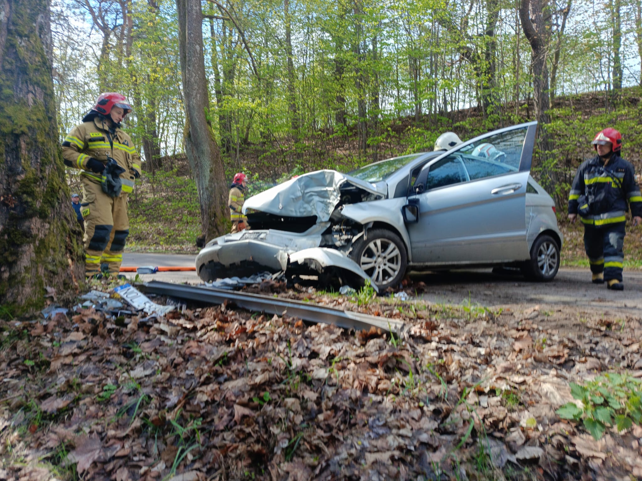 Samochód osobowy, którym podróżowały dwie osoby, uderzył w drzewo. Na miejsce szybko dotarły służby ratunkowe, by udzielić pomocy poszkodowanym i zabezpieczyć miejsce wypadku.