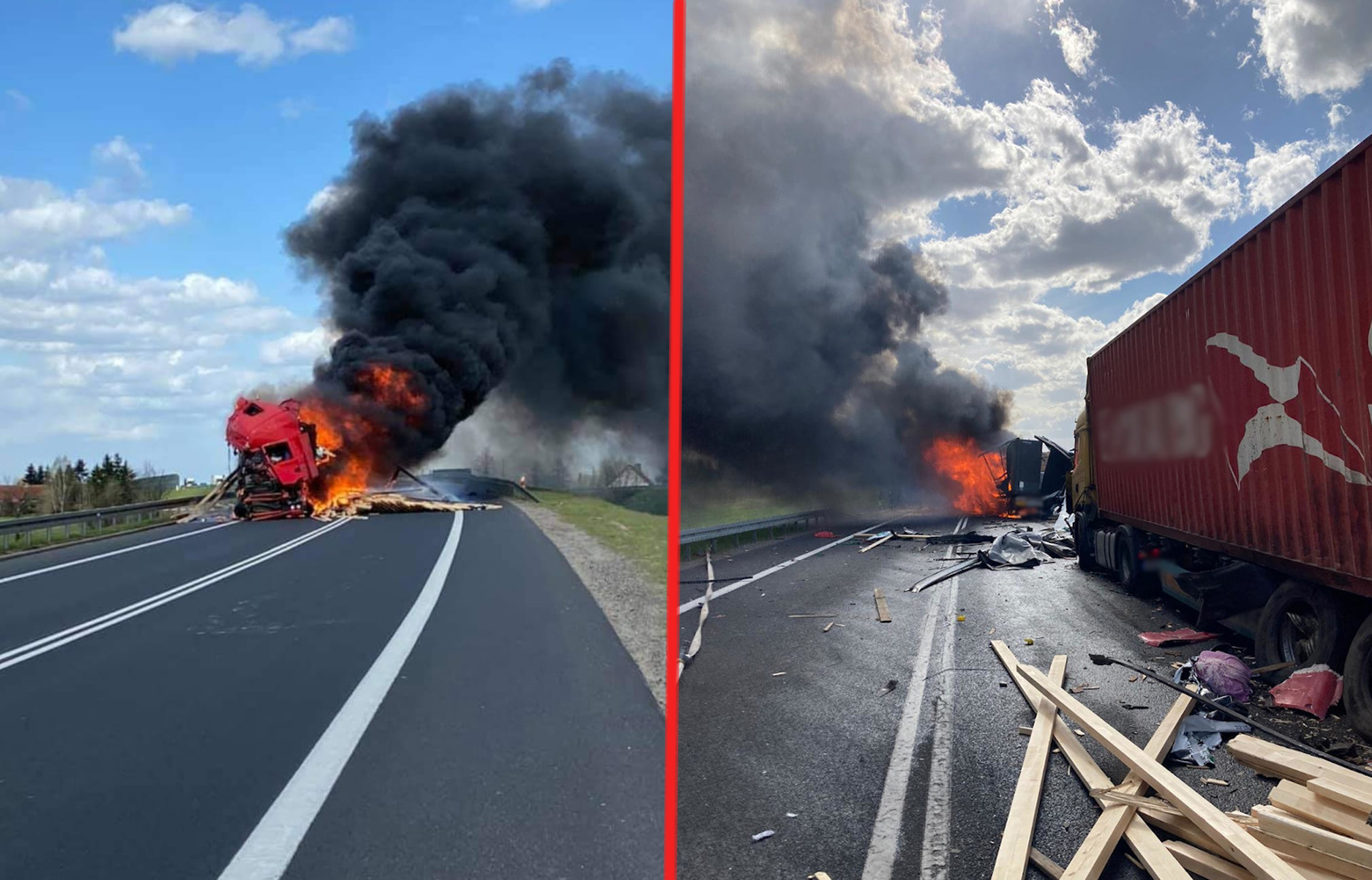 Jedno z aut stanęło w płomieniach. Na szczęście nikt nie odniósł poważnych obrażeń. Policjanci kierują na objazdy przez m. Kromerowo i Nowe Marcinkowo.