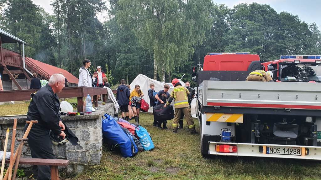 Przez około pół godziny padał intensywny deszcz, wiał silny wiatr oraz występowały wyładowania atmosferyczne. Tak krótki czas wystarczył, aby burza wyrządziła poważne szkody. Do stanowiska kierowania komendanta powiatowego Państwowej Straży Pożarnej w Ostródzie zaczęły napływać zgłoszenia jedno, po drugim. Informowano o powalonych drzewach na drogi i chodniki, a także na linie energetyczne i trakcję kolejową. Między innymi w okolicach Starych Jabłonek, co spowodowało wstrzymanie ruchu kolejowego na ponad dwie godziny. Do poważnej sytuacji doszło w okolicy miejscowości Wenecja, gdzie nawałnica powaliła kilka drzew na obóz harcerski, na którym przebywało blisko 170 osób, w tym ponad 150 dzieci. Na szczęście nikomu nic się nie stało. Zadziałał system ostrzegania, który został wypracowany cztery lata temu. Harcerze z wyprzedzeniem otrzymali z ostródzkiej Komendy Powiatowej PSP informację o zbliżającym się niebezpieczeństwie. Kadra obozowa ogłosiła ewakuację uczestników i pomimo zniszczonych namiotów wszyscy uczestnicy zdołali się schronić w miejscu bezpiecznym. Obecnie na terenie obozu trwa ewakuacja, którą koordynują strażacy z ostródzkiej Komendy Powiatowej PSP pod dowództwem Zastępcy Komendanta Powiatowego, a całą akcją dowodzi Zastępca Warmińsko-Mazurskiego Komendanta Wojewódzkiego PSP, który wraz z grupą operacyjną KW PSP, jest na miejscu działań. Ponadto w miejscowości Gumniska Małe z bloku mieszkalnego wiatr zerwał dach. Budynek nadaje się do dalszego zamieszkania. Strażacy zabezpieczyli plandekami około 30 m2 poszycia dachu. Obecnie na terenie całego powiatu odnotowano blisko 90 interwencji, które podjęli strażacy PSP i OSP z terenu całego powiatu ostródzkiego. Kolejne zgłoszenia wciąż napływają.