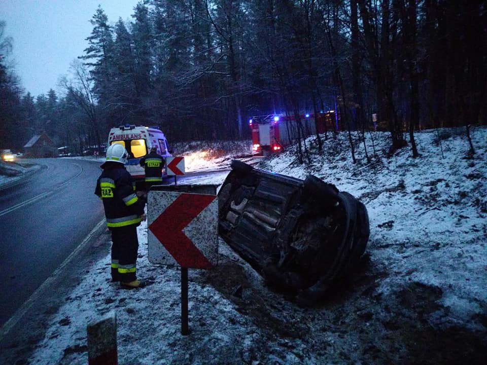 Na znanym z ”wypadów” łuku drogi auto osobowe po wcześniejszym wpadnięciu w poślizg dachowało. Na szczęście kierujący opuścił pojazd o własnych siłach. Po przebadaniu przez ZRM pozostał na miejscu. Utrudnienia w ruchu trwały około godziny.
