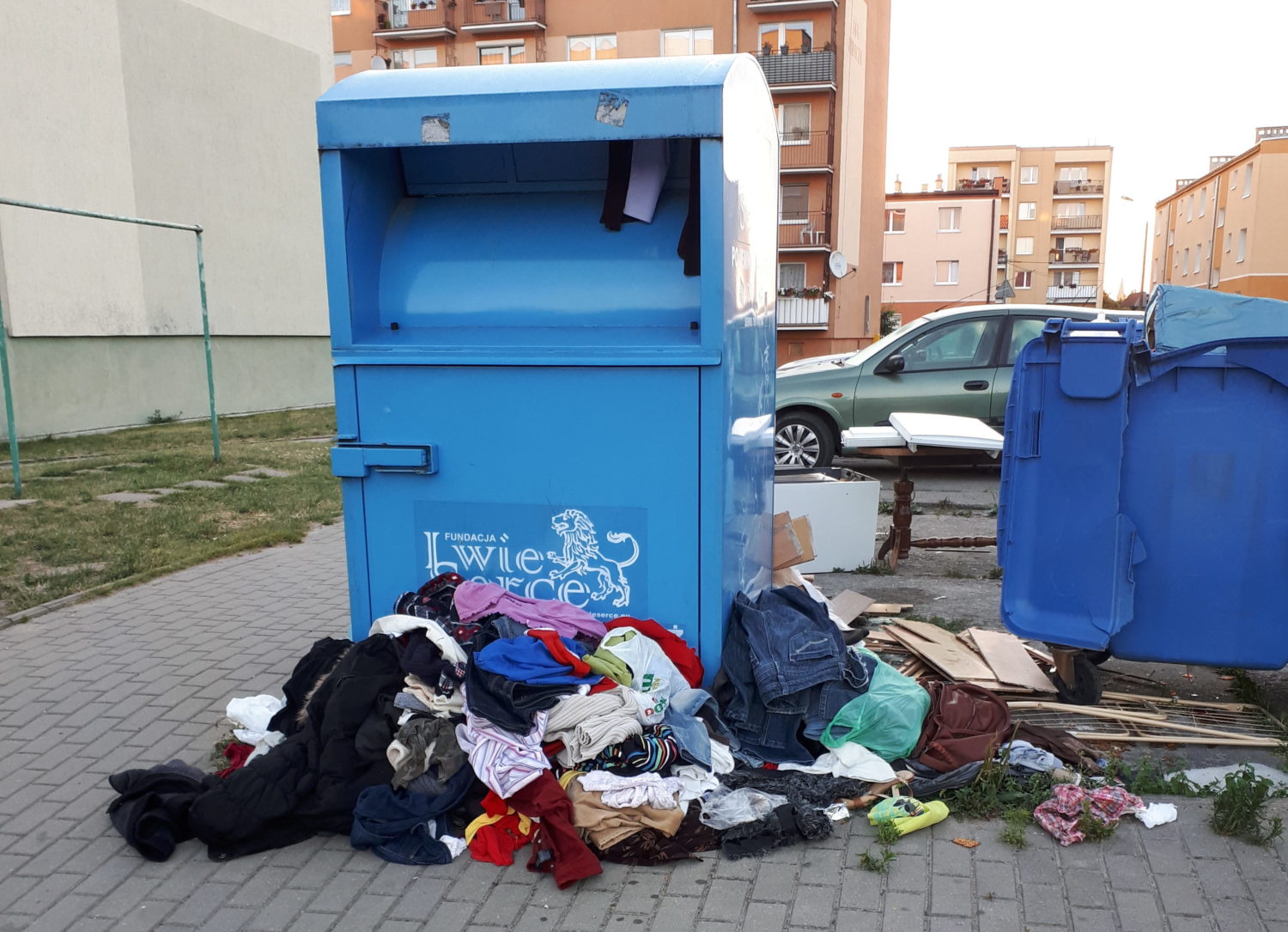 Druga rzecz, jest taka, że pojemniki nie są dość często opróżniane, w związku z tym napisaliśmy zapytanie do Fundacji kiedy ta zamierza zabrać ubrania zalegające w środku.