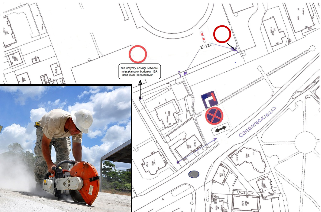 Na wspomnianym wjeździe stanowiącym dojazd do stadionu zostanie zmieniona organizacja ruchu polegająca na ustawieniu znaków pionowych D-4b ( droga