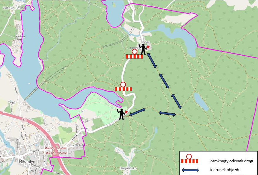 Ruch kołowy zostanie przekierowany na drogi leśne wyznaczonym objazdem przy wsparciu osób kierujących ruchem, którzy będą informować o możliwości dojazdu do posesji.