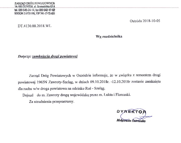 Zarząd Dróg Powiatowych informuje, iż w związku z remontem drogi powiatowej 1965N Zawroty – Szeląg, w dniach 9-12.10.2018 zostanie zamknięta dla ruchu droga powiatowa na odcinku Ruś – Szeląg.