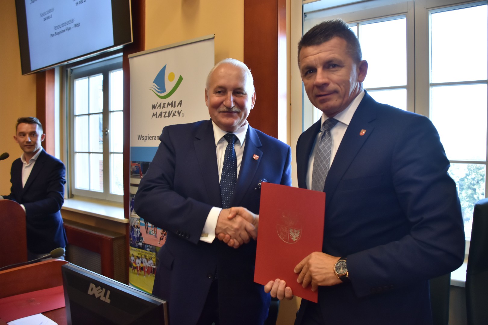 Wójt Gminy Ostróda Bogusław Fijas oraz Z-ca Skarbnika Gminy Ostróda Anna Płecha wraz z Marszałkiem Województwa Warmińsko-Mazurskiego Gustawem Markiem Brzezinem podpisali umowy na realizację zadań własnych gminy w ramach konkursów „Małe granty na infrastrukturę sportową w Województwie Warmińsko-Mazurskim w 2019 r.” oraz „Łączy nas turystyka”. Dofinansowanie Samorządu Województwa Warmińsko-Mazurskiego wynosi 50% wartości inwestycji.