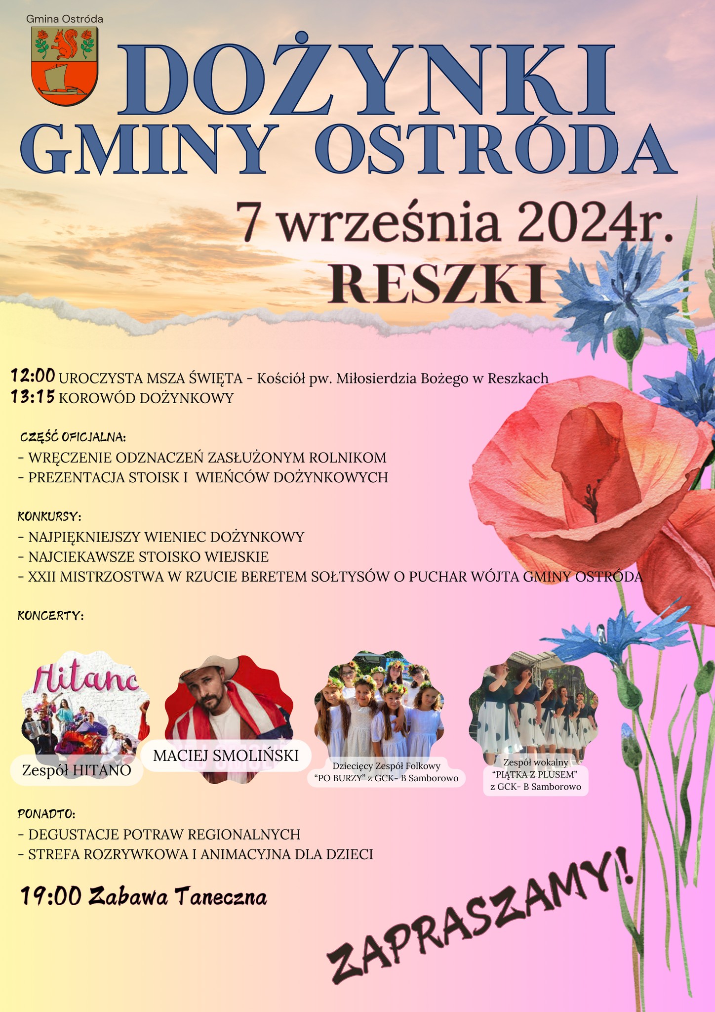 Zapraszamy serdecznie wszystkich mieszkańców i gości na Dożynki Gminne, które odbędą się w Reszkach już 7 września! To wyjątkowe wydarzenie pełne folkloru i tradycji, które z pewnością pozostanie w pamięci na długo.