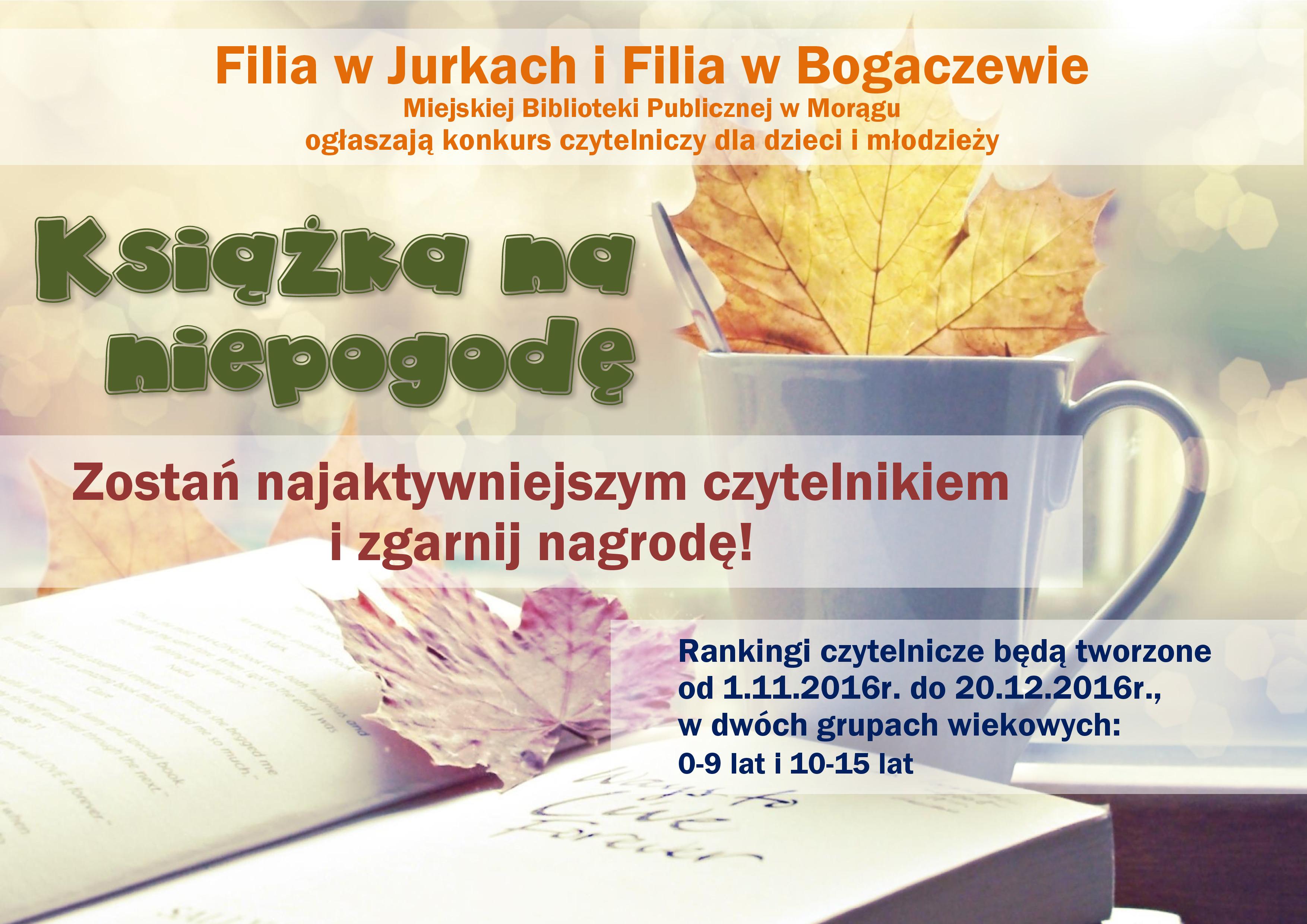 Filia w Jurkach i Filia w Bogaczewie Miejskiej Biblioteki Publicznej w Morągu ogłasza konkurs czytelniczy „Książka na niepogodę”.