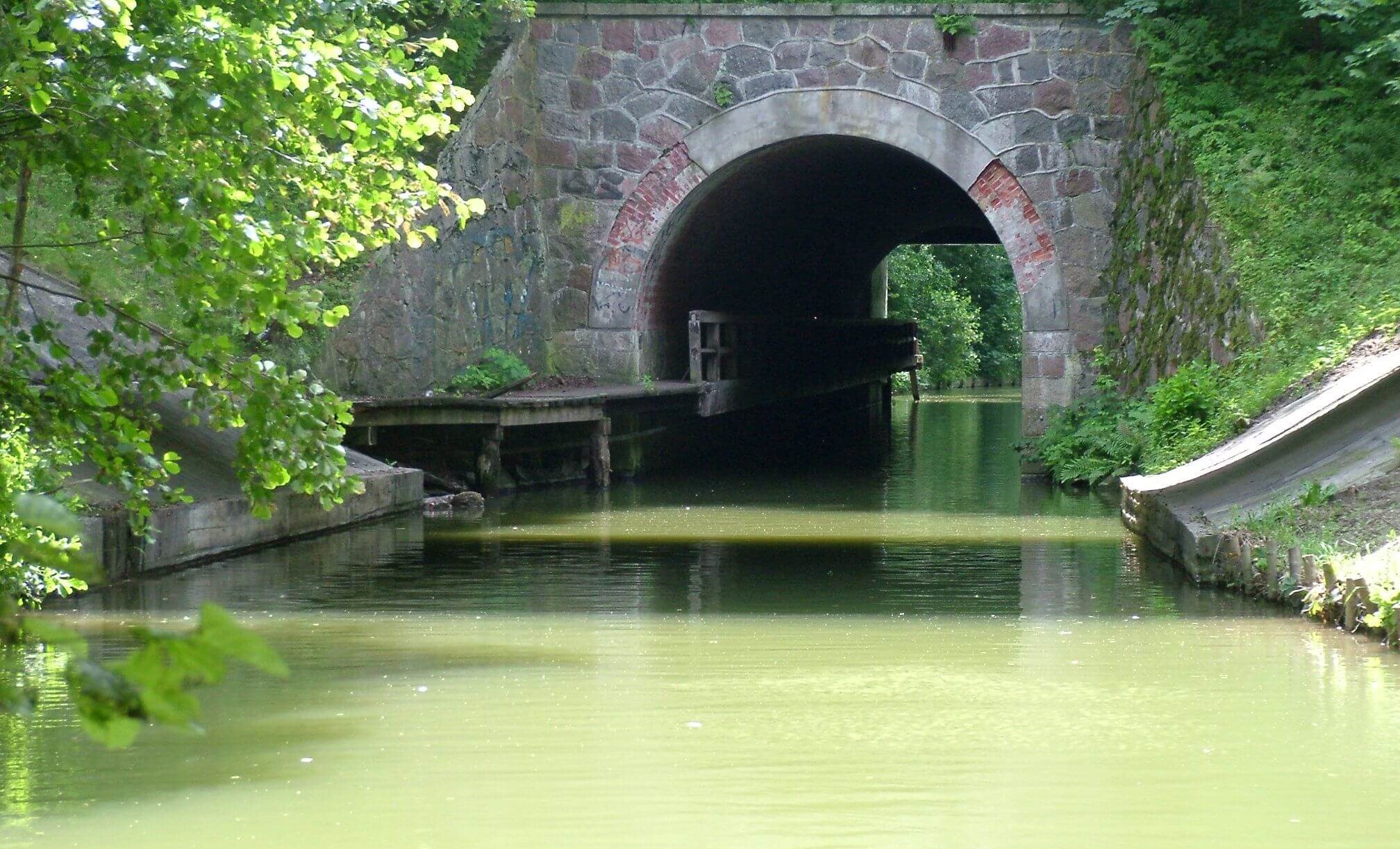 Najpierw wybudowano tunel o długości blisko 54 m – prawdopodobnie najdłuższy w Polsce i wysklepiony w celu umożliwienia żeglugi. Ściany wymurowano z kamienia, a sklepienie z cegły. Pomimo upływu niemal stu pięćdziesięciu lat ściany tunelu nie przemakają. Wzdłuż wschodniej ściany poprowadzono kładkę dla pieszych i zarazem ścieżkę holowniczą, skonstruowaną z dyli drewnianych.