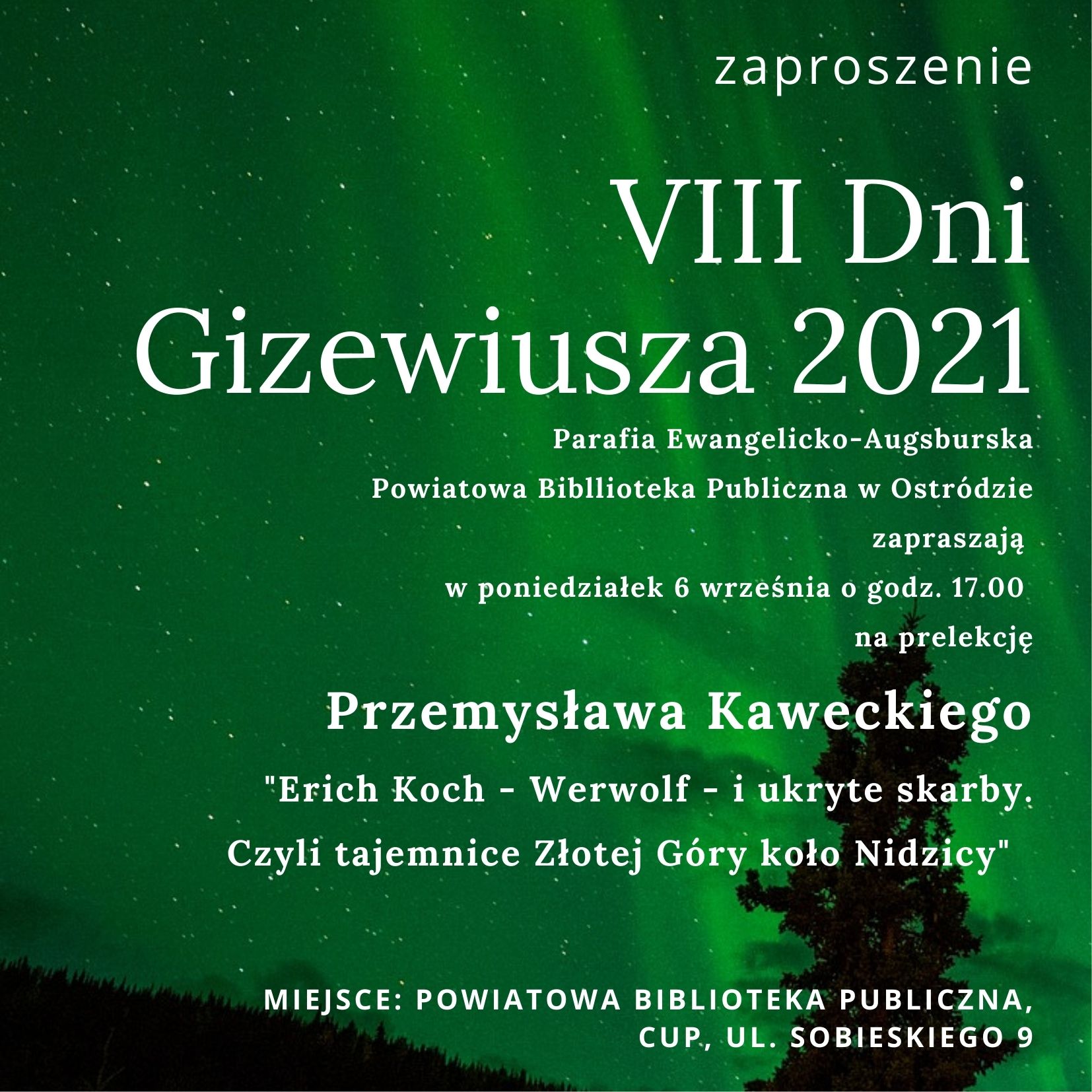 W poniedziałek 6 września o godz. 17.00 czeka nas nie lada gratka dla miłośników historii. Z okazji VIII Dni Gizewiusza, prelekcję pt. „Erich Koch – Werwolf – i ukryte skarby. Czyli tajemnice Złotej Góry koło Nidzicy”, wygłosi Przemek Kawecki.