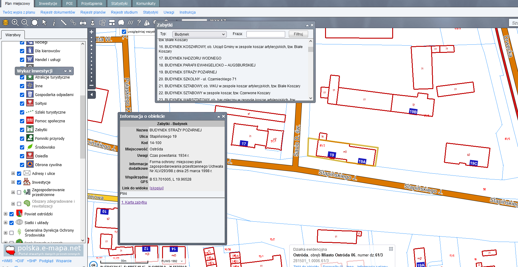 W portalu znajdują się dane dotyczące zabytków, realizowanych przez Gminę Miejską Ostróda inwestycji i strefy rewitalizacji.