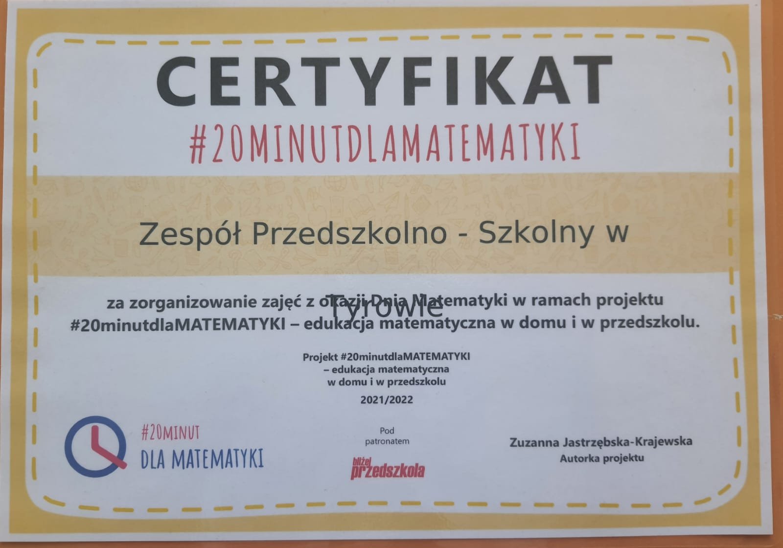 12. Certyfikat „20 minut dla matematyki” za zorganizowanie zajęć z okazji Dnia Matematyki.