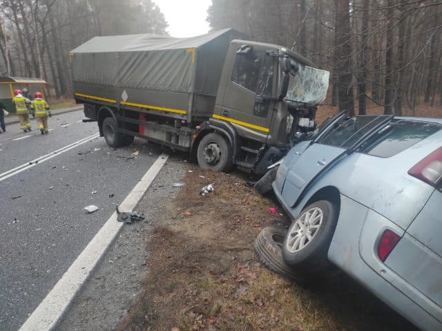 W wypadku udział brały 3 pojazdy: ciężarówka wojskowa, auto osobowe i bus z naczepą.