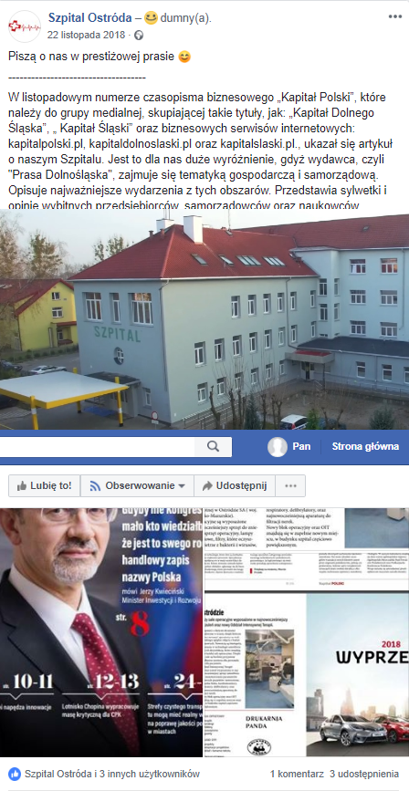 Tymczasem na facebookowym profilu szpitala i stronie internetowej pojawiają informacje o laurach jakie szpital zdobywa, na przykład o tym, że o placówce pisze się w prestiżowej prasie. Szpital potrafi nawet pochwalić się  ”spływającymi podziękowaniami”, które są niczym więcej niż… podziękowaniem od wojewody i dyrektora NFZ za zaproszenie na otwarcie pracowni RTG!