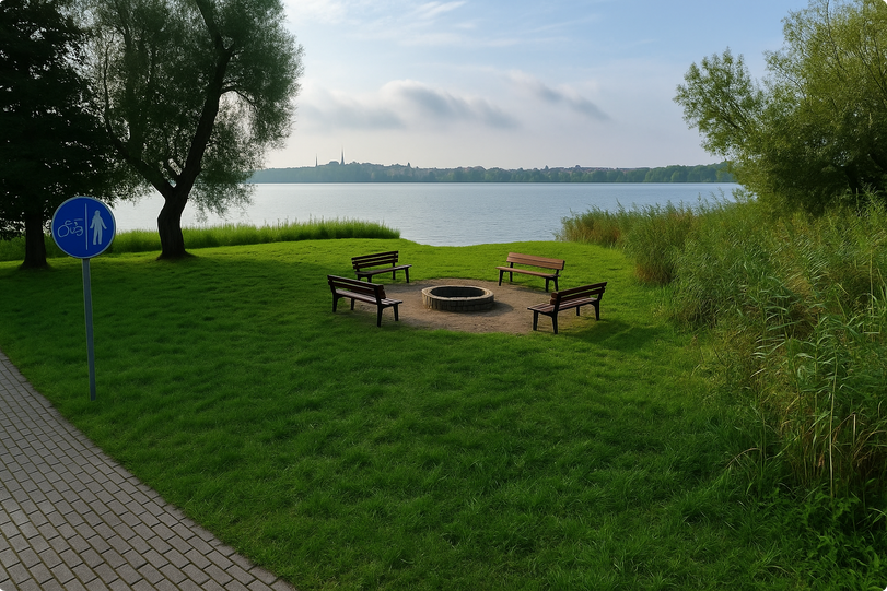 Stworzenie przestrzeni rekreacyjno-wypoczynkowej z ławkami i miejscem na ognisko na cyplu nad jeziorem Drwęckim, w pobliżu mostka obok hotelu, naprzeciwko osiedla.