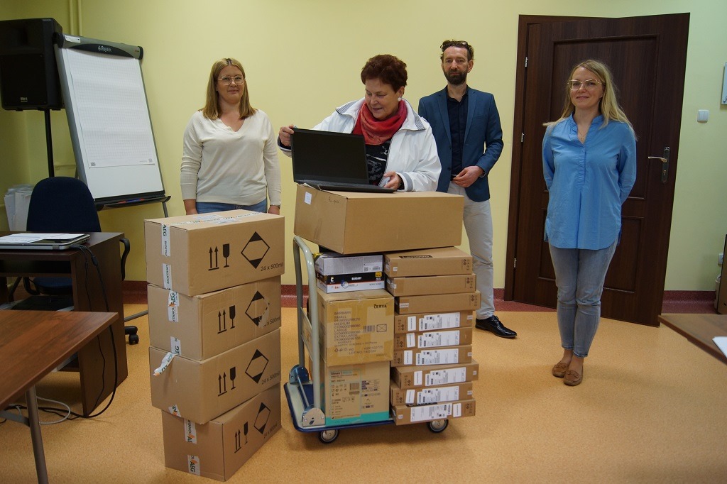Starosta Ostródzki Andrzej Wiczkowski i Dyrektor Powiatowego Centrum Pomocy Rodzinie w Ostródzie Tomasz Podsiadło, uroczyście przekazali dyrektorom placówek opiekuńczo-wychowawczych łącznie: 19 laptopów, 1 500 sztuk maseczek jednorazowych, 100 litrów płynu do dezynfekcji oraz 7 500 sztuk rękawiczek jednorazowych.