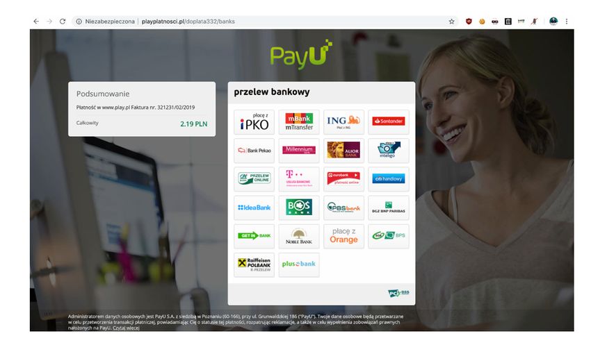 - Uważaj na wszystkie wiadomości o konieczności zapłaty lub dopłaty drobnych kwot (np. 0,76 PLN) zawierające link do strony udającej pośrednika płatności. Przed wykonaniem przelewu skontaktuj się z firmą, która figuruje jako nadawca wiadomości (np. operator telekomunikacyjny, sklep czy serwis internetowy).
