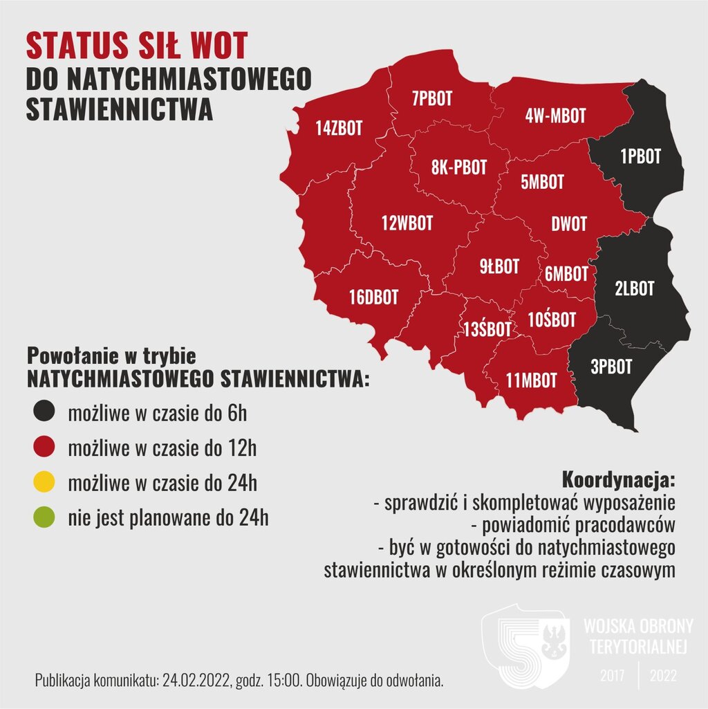 Wszyscy żołnierze Wojsk Obrony Terytorialnej są zobowiązani do sprawdzenia wyposażenia, powiadomienia pracodawców oraz zapewnienia sobie możliwości stawiennictwa w zmienionym reżimie czasowym.