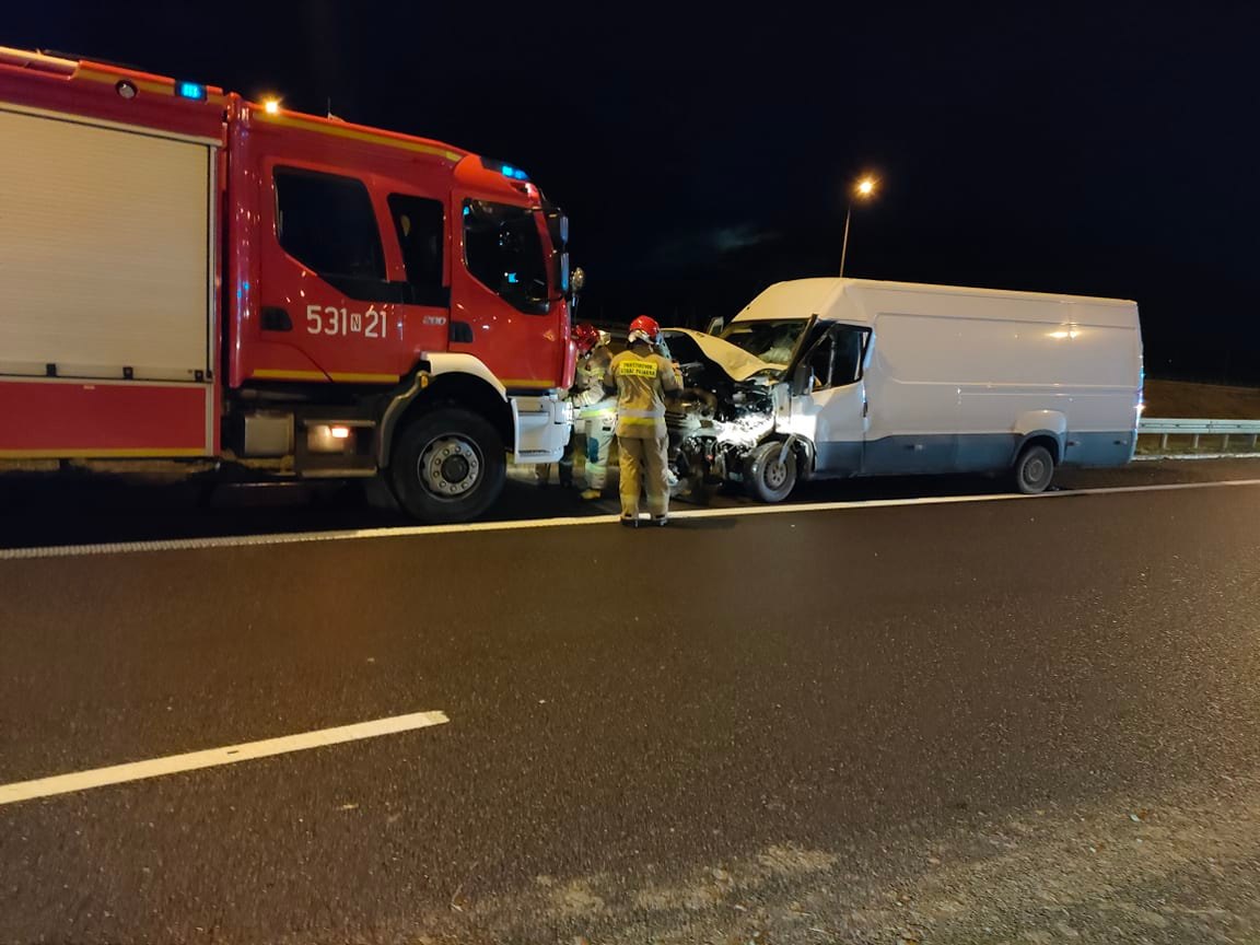 Na miejsce zdarzenia drogowego jedzie właśnie straż pożarna, policja i pogotowie ratunkowe. Ze wstępnych ustaleń wynika, iż kierowca busa nie zachował należytej odległości i wjechał w tył tira. Jedna osoba jest poszkodowana.