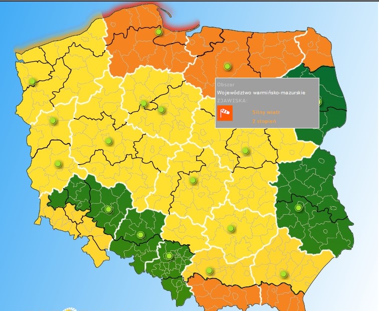 Późnym popołudniem, do północnych krańców Polski, dotrze aktywny front chłodny. Z północnego zachodu będzie napływać ciepłe powietrze polarne morskie. Na obszarze całego kraju prognozowany jest zachodni wiatr umiarkowany i dość silny, który osiągał będzie w porywach do 90 km/h na wybrzeżu i w górach, a na pozostałym obszarze od 55 km/h do 65 km/h.