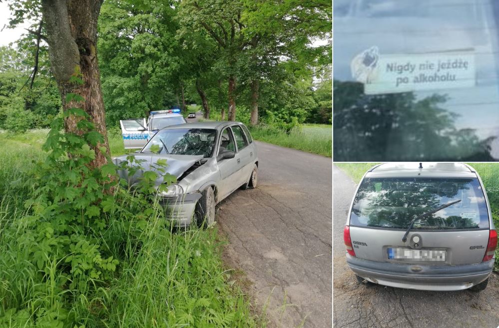 ”Nigdy nie jeżdżę po alkoholu” – taką naklejkę miał na szybie samochodzie kierujący. Jak się okazało, on i jego żona (pasażerka) byli pod wpływem alkoholu. Kobieta została zabrana do szpitala, a mężczyzna… Leżał w polu.