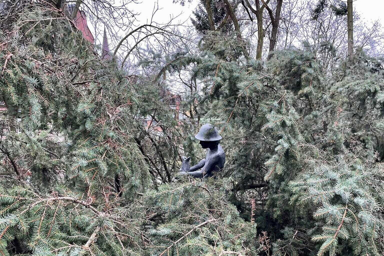 W sobotę, stara sosna pod wpływem bardzo silnego wiatru powaliła się na Fontannę Rybaka. Pień drzewa na szczęście ominął symboliczną dla Ostródy rzeźbę.