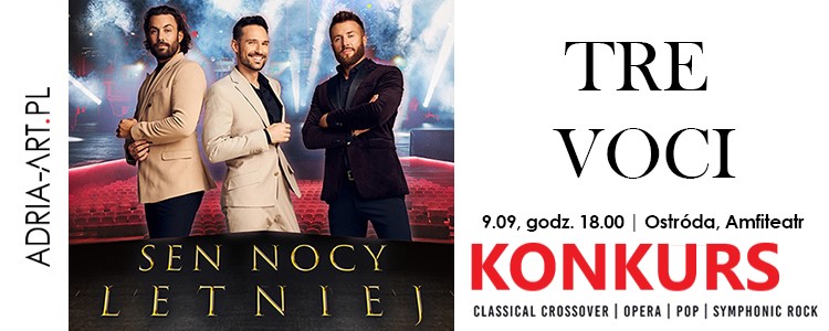 3.1 Nagrodą w konkursie jest podwójna wejściówka na koncert Tre Voci – Sen Nocy Letniej, który odbędzie się w dniu 09.09.2023 w amfiteatrze w Ostródzie o godzinie 18:00.